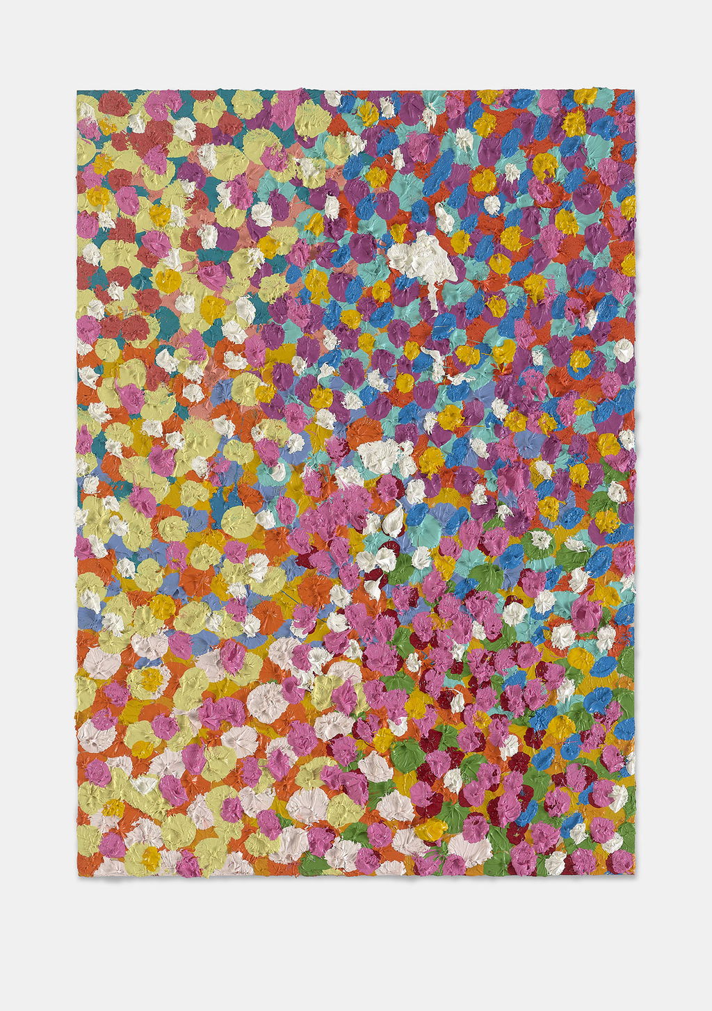 The Paper Veils are a series of 300 striking paintings on card completed in 2019, and available in two sizes. These paintings are a riotous ensemble of energetically coloured and thickly painted dots. Across each composition, Hirst revels in the joy of colour and the physicality of paint.