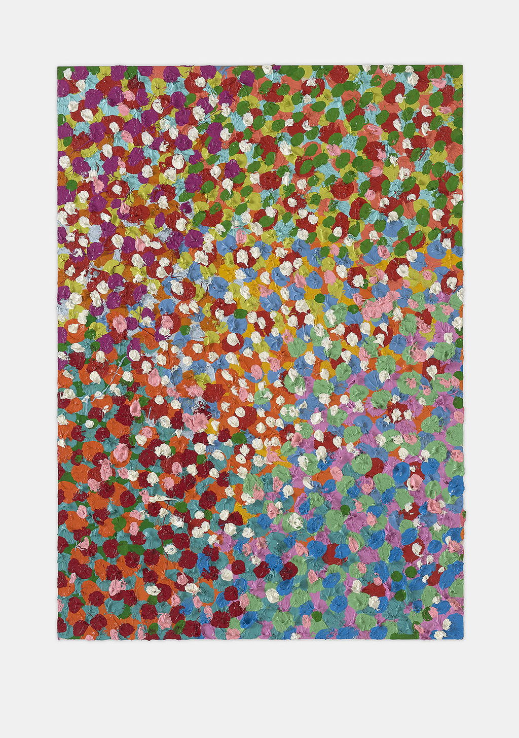 The Paper Veils are a series of 300 striking paintings on card completed in 2019, and available in two sizes. These paintings are a riotous ensemble of energetically coloured and thickly painted dots. Across each composition, Hirst revels in the joy of colour and the physicality of paint.