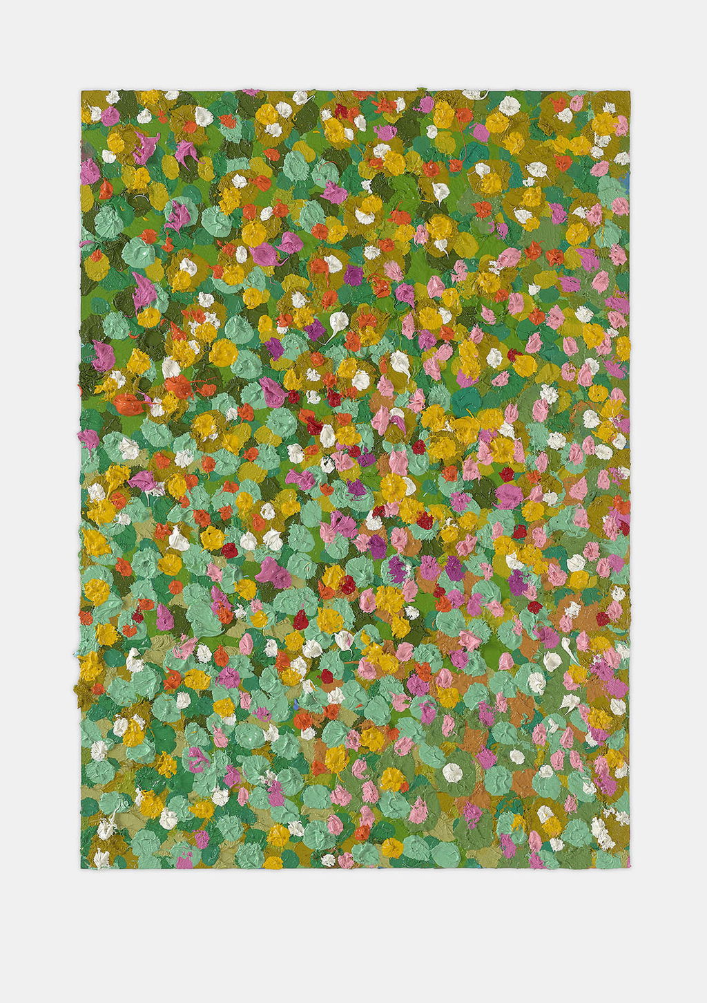 The Paper Veils are a series of 300 striking paintings on card completed in 2019, and available in two sizes. These paintings are a riotous ensemble of energetically coloured and thickly painted dots. Across each composition, Hirst revels in the joy of colour and the physicality of paint.