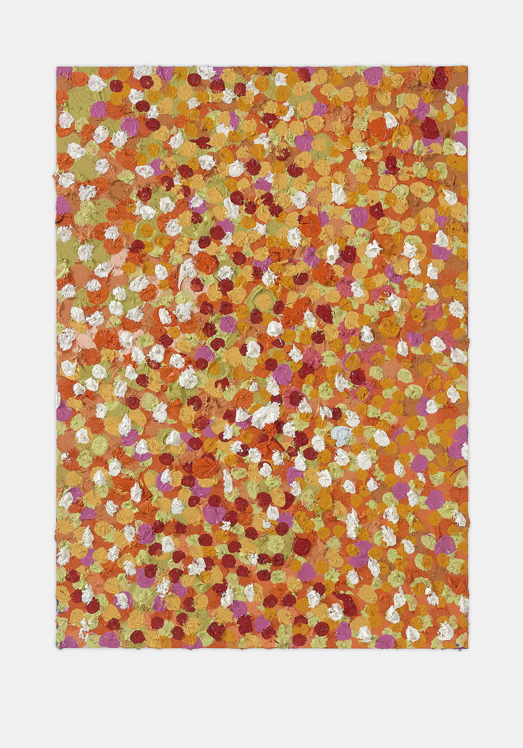 The Paper Veils are a series of 300 striking paintings on card completed in 2019, and available in two sizes. These paintings are a riotous ensemble of energetically coloured and thickly painted dots. Across each composition, Hirst revels in the joy of colour and the physicality of paint.