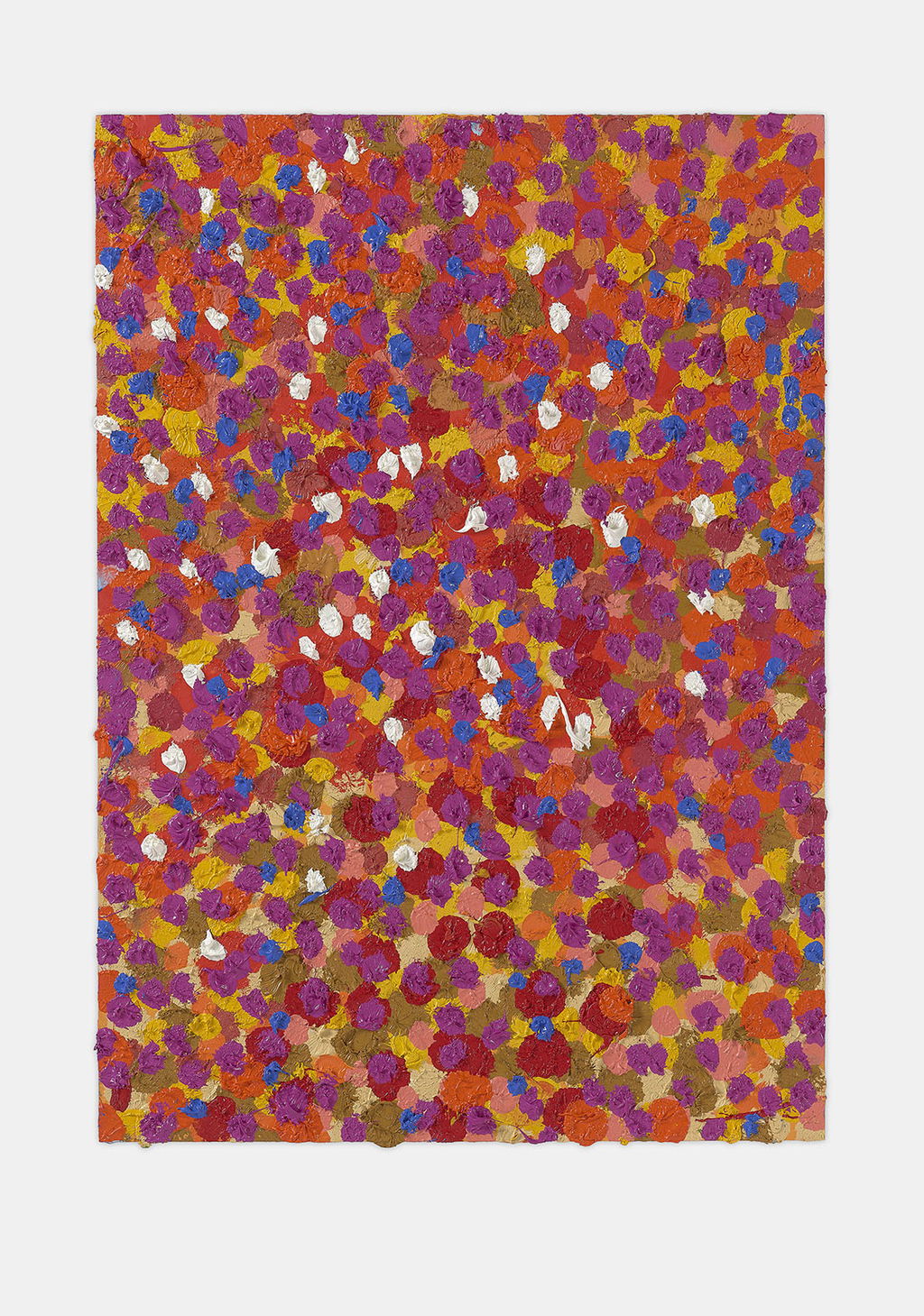 The Paper Veils are a series of 300 striking paintings on card completed in 2019, and available in two sizes. These paintings are a riotous ensemble of energetically coloured and thickly painted dots. Across each composition, Hirst revels in the joy of colour and the physicality of paint.