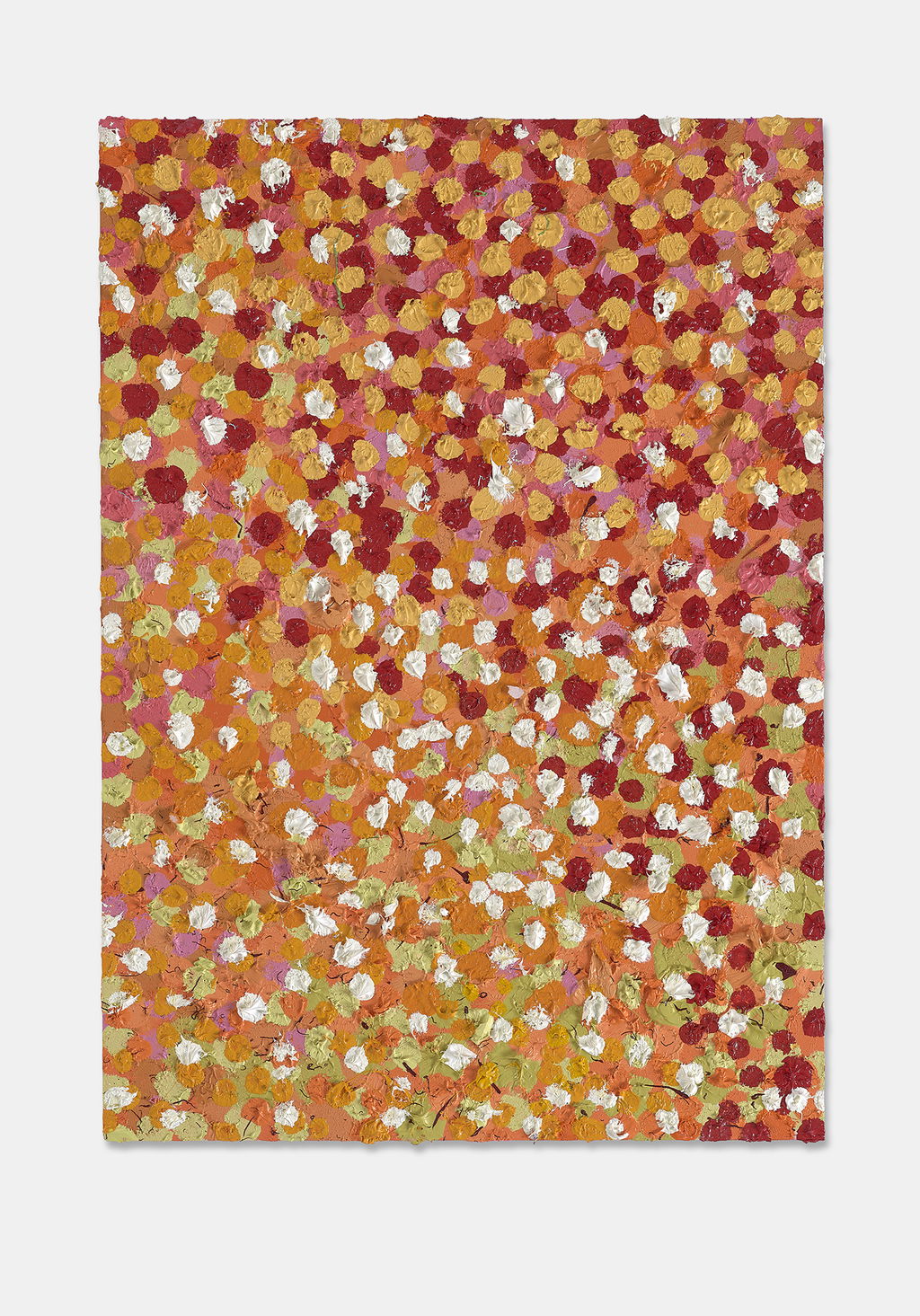 The Paper Veils are a series of 300 striking paintings on card completed in 2019, and available in two sizes. These paintings are a riotous ensemble of energetically coloured and thickly painted dots. Across each composition, Hirst revels in the joy of colour and the physicality of paint.
