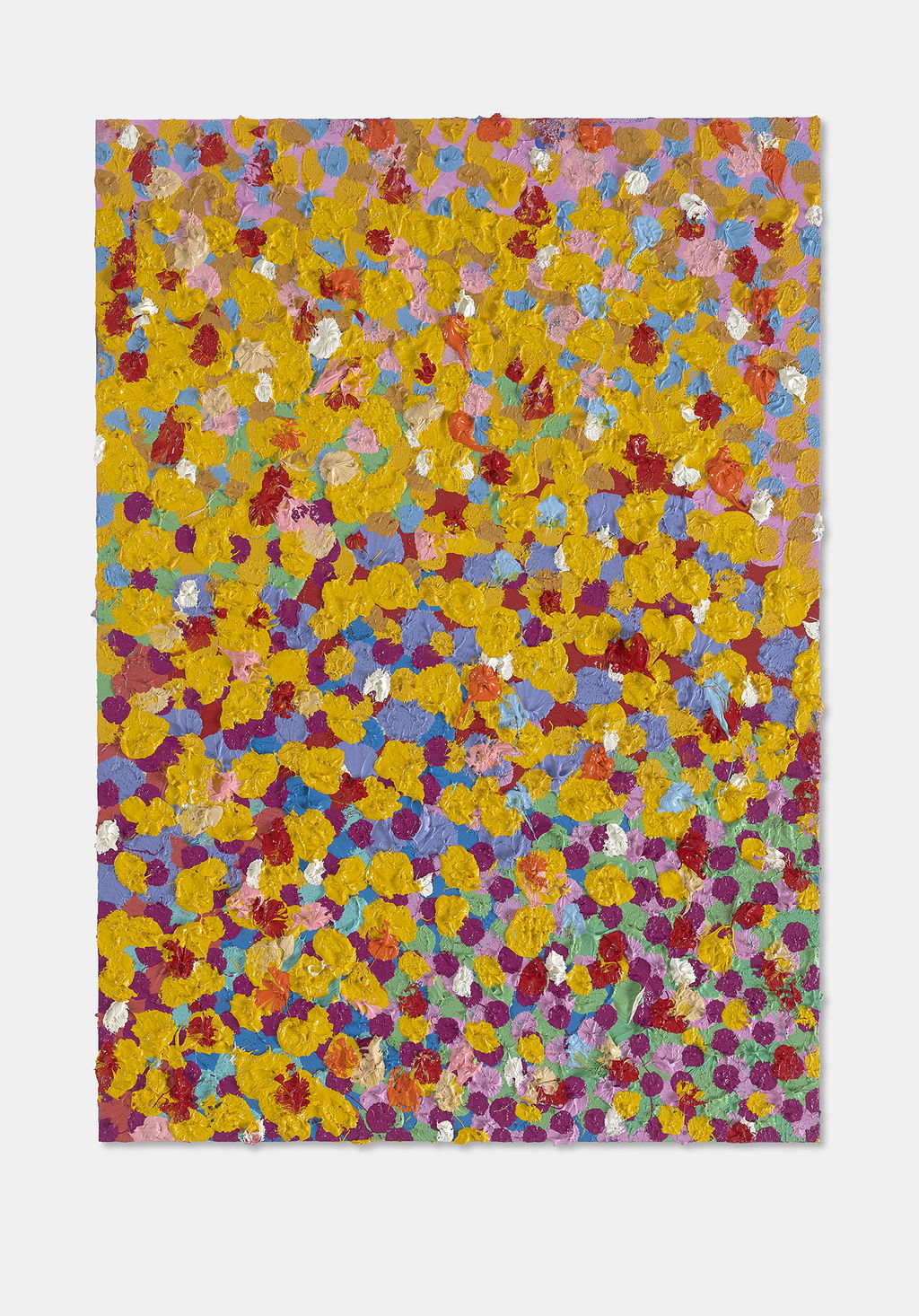 The Paper Veils are a series of 300 striking paintings on card completed in 2019, and available in two sizes. These paintings are a riotous ensemble of energetically coloured and thickly painted dots. Across each composition, Hirst revels in the joy of colour and the physicality of paint.