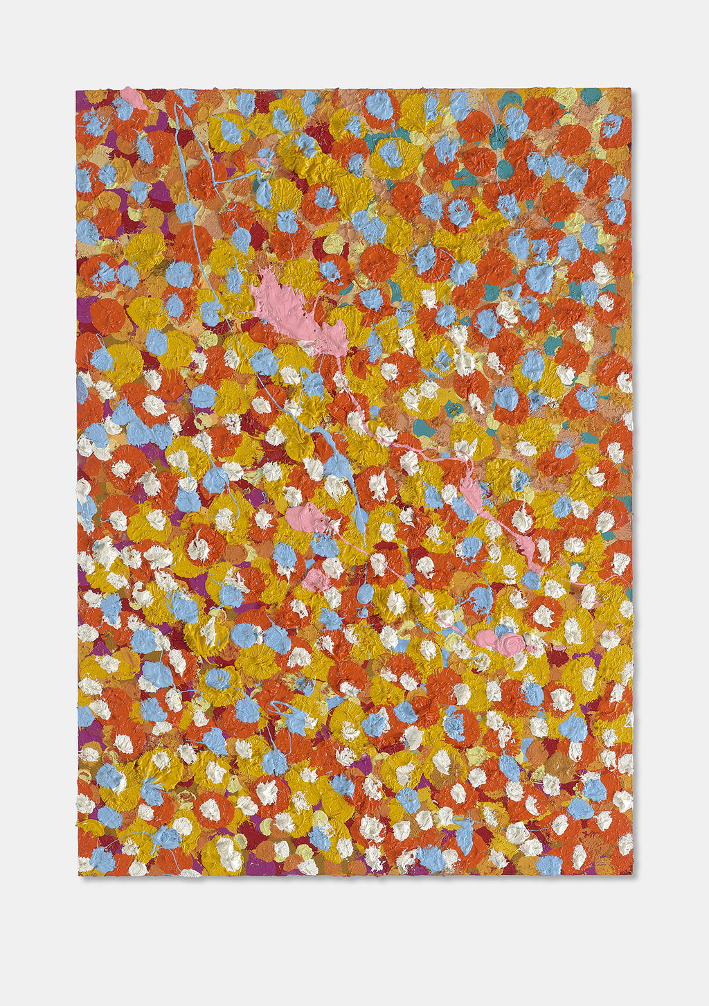 The Paper Veils are a series of 300 striking paintings on card completed in 2019, and available in two sizes. These paintings are a riotous ensemble of energetically coloured and thickly painted dots. Across each composition, Hirst revels in the joy of colour and the physicality of paint.