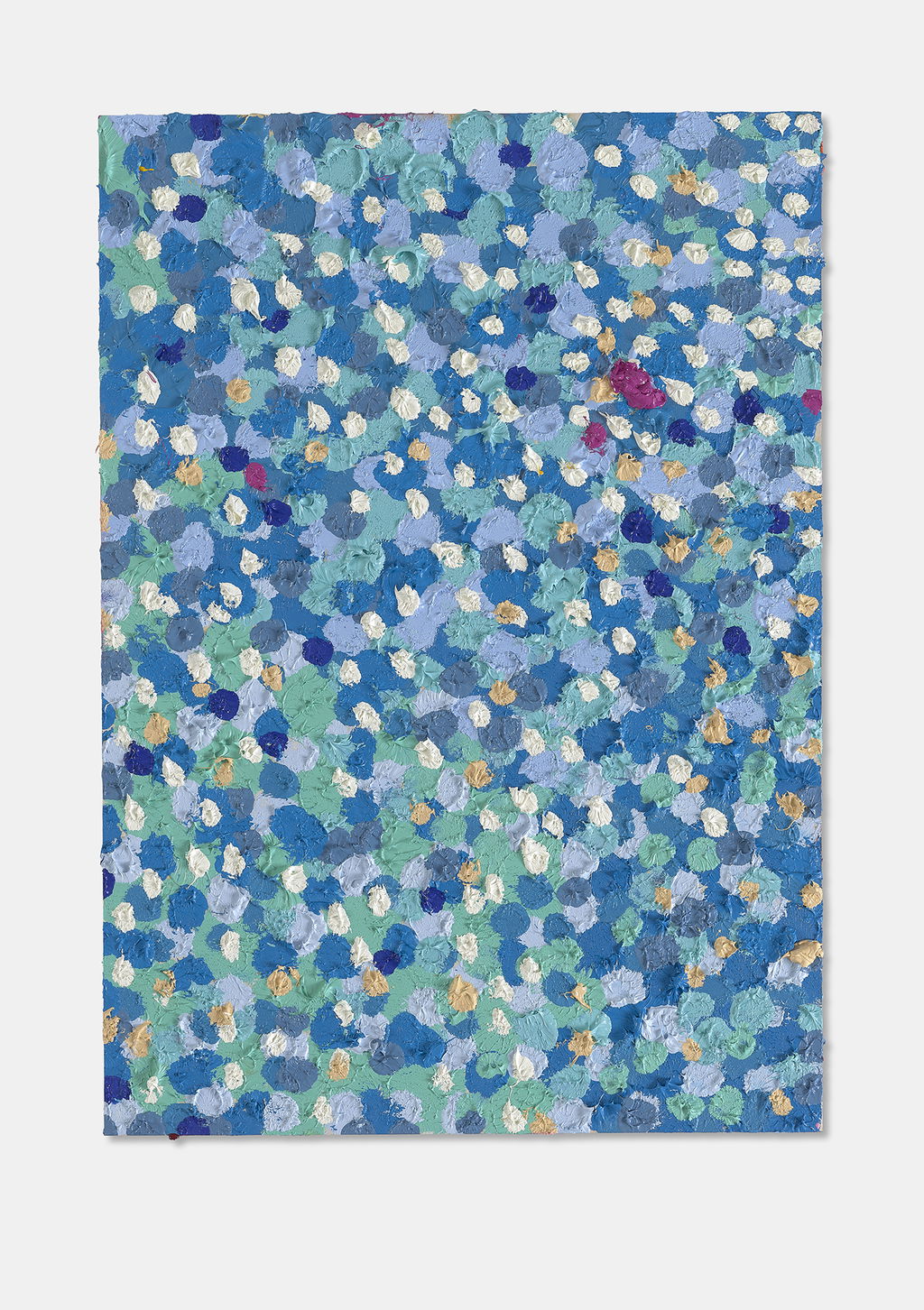 The Paper Veils are a series of 300 striking paintings on card completed in 2019, and available in two sizes. These paintings are a riotous ensemble of energetically coloured and thickly painted dots. Across each composition, Hirst revels in the joy of colour and the physicality of paint.