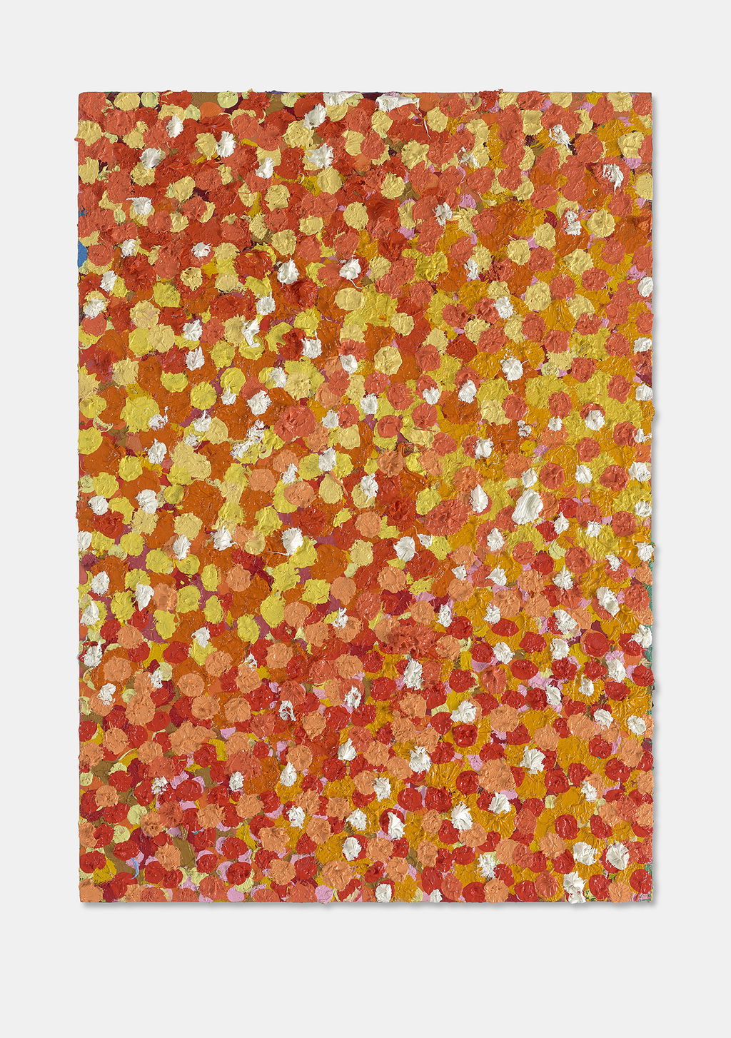 The Paper Veils are a series of 300 striking paintings on card completed in 2019, and available in two sizes. These paintings are a riotous ensemble of energetically coloured and thickly painted dots. Across each composition, Hirst revels in the joy of colour and the physicality of paint.