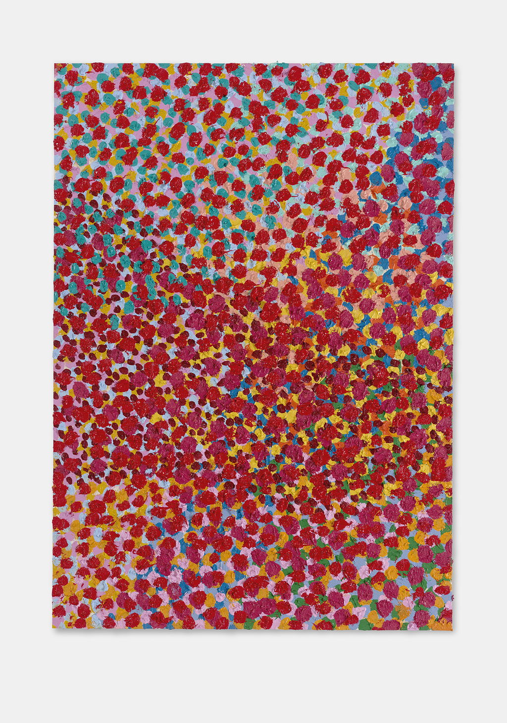 The Paper Veils are a series of 300 striking paintings on card completed in 2019, and available in two sizes. These paintings are a riotous ensemble of energetically coloured and thickly painted dots. Across each composition, Hirst revels in the joy of colour and the physicality of paint.