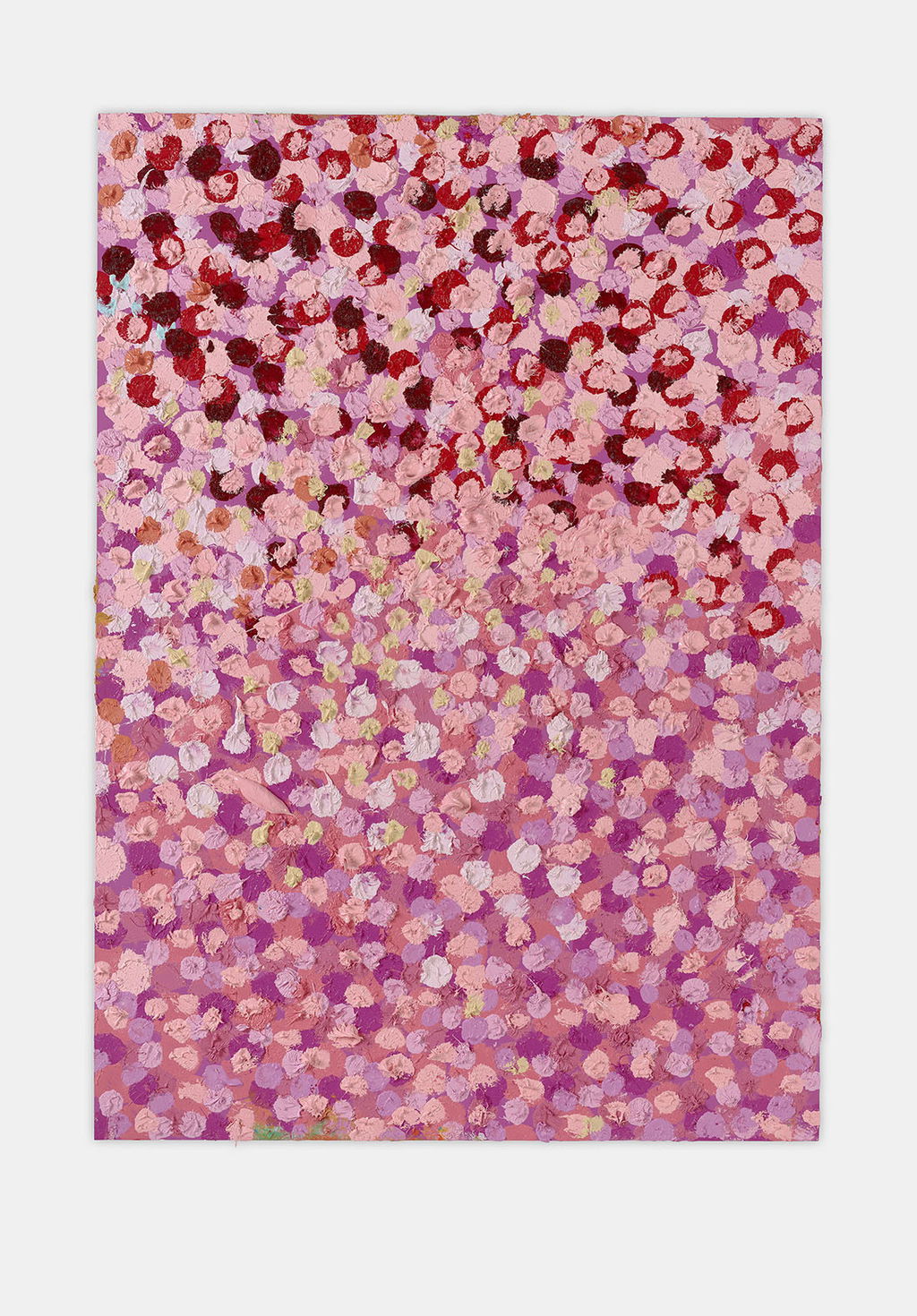 The Paper Veils are a series of 300 striking paintings on card completed in 2019, and available in two sizes. These paintings are a riotous ensemble of energetically coloured and thickly painted dots. Across each composition, Hirst revels in the joy of colour and the physicality of paint.