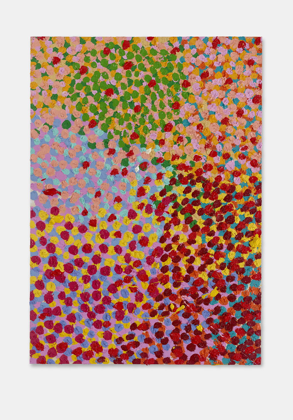 The Paper Veils are a series of 300 striking paintings on card completed in 2019, and available in two sizes. These paintings are a riotous ensemble of energetically coloured and thickly painted dots. Across each composition, Hirst revels in the joy of colour and the physicality of paint.