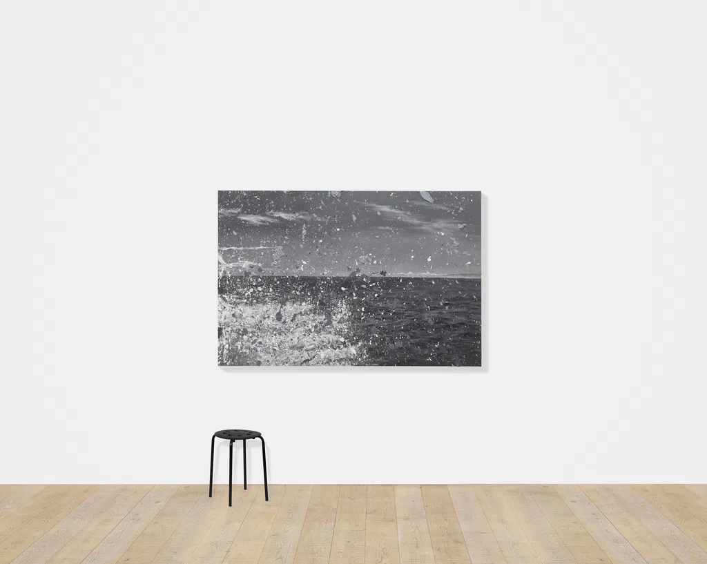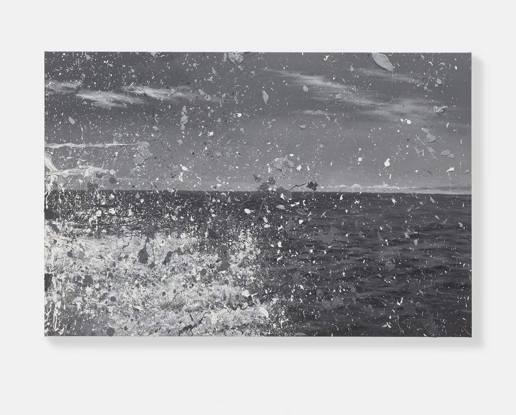 'Seascapes' uses the photorealistic scenes of ’Sea Paintings’ as the basis onto which Hirst creates additional and tactile layers of action through splattered paint.