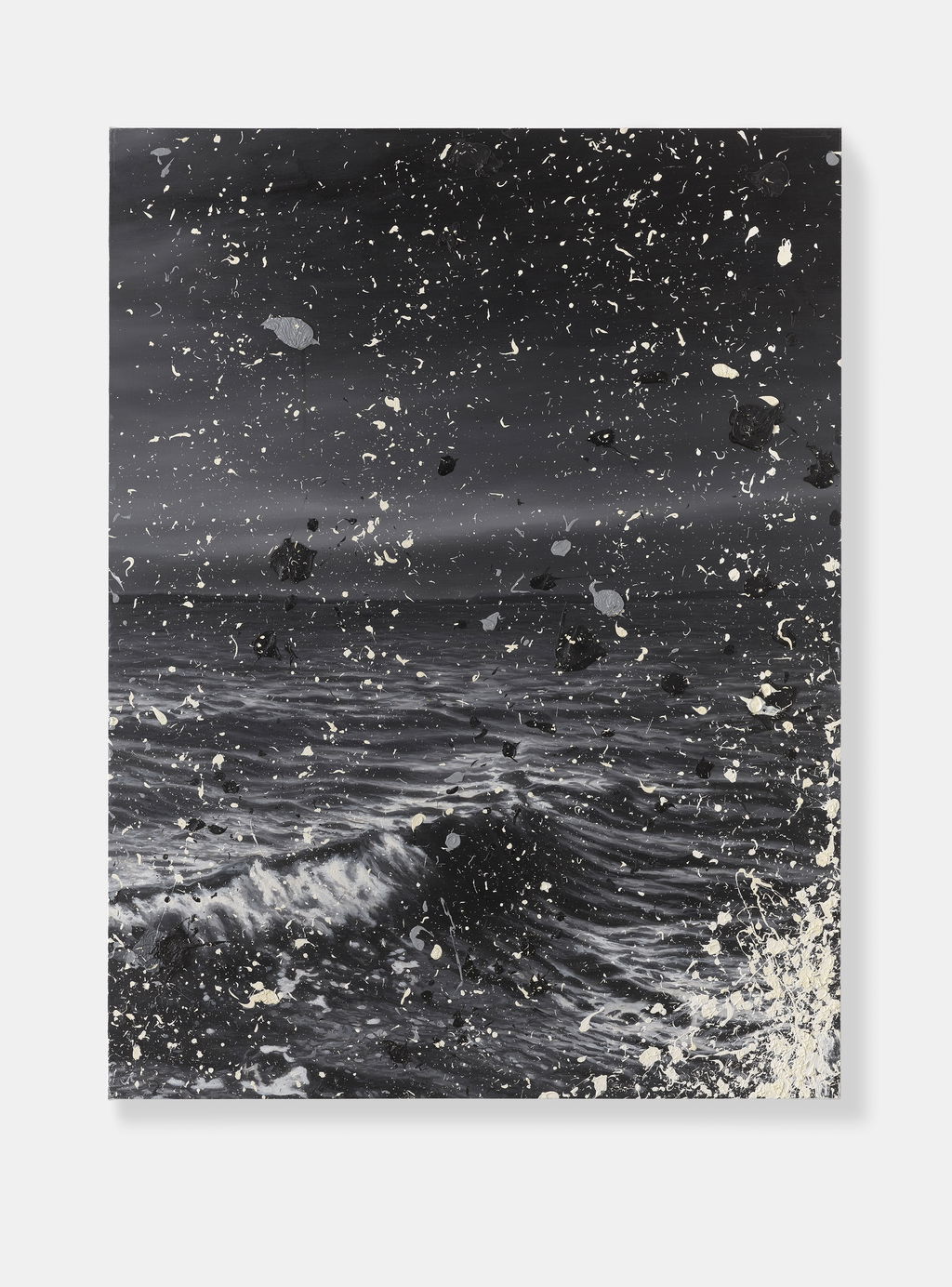 'Seascapes' uses the photorealistic scenes of ’Sea Paintings’ as the basis onto which Hirst creates additional and tactile layers of action through splattered paint.