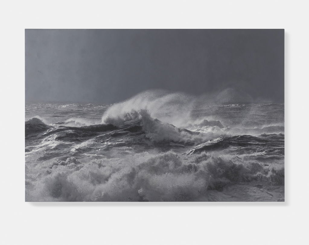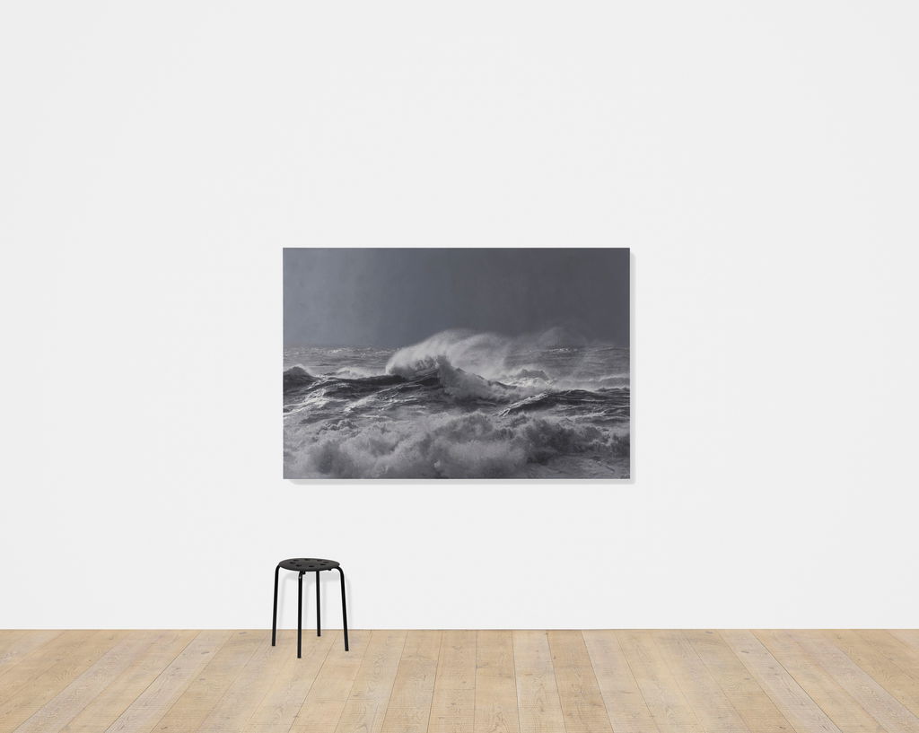 'Sea Paintings' marks the latest iteration in Hirst’s long-established practice of producing paintings after photographs, and freezes in greyscale the power and energy of coastal storms.