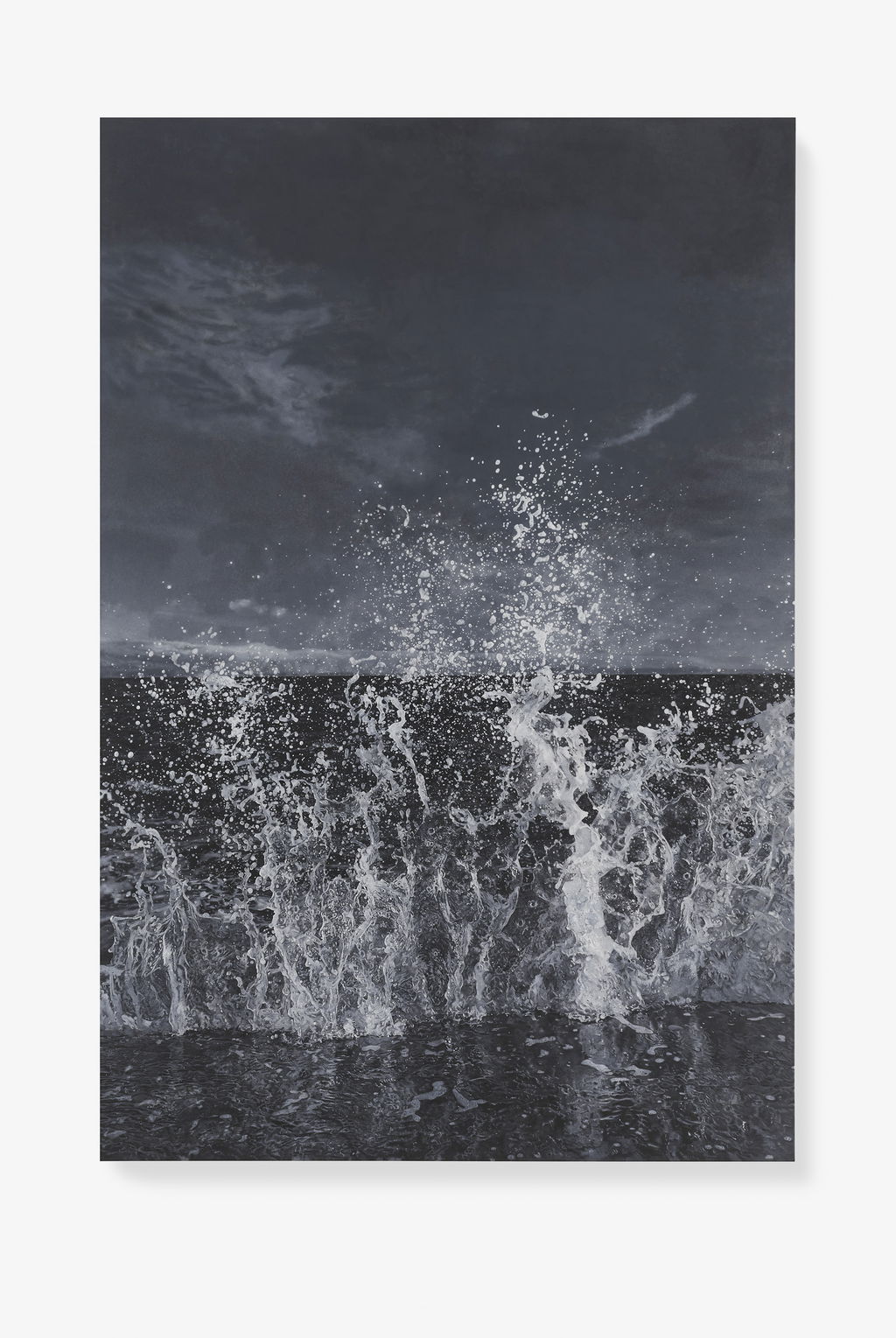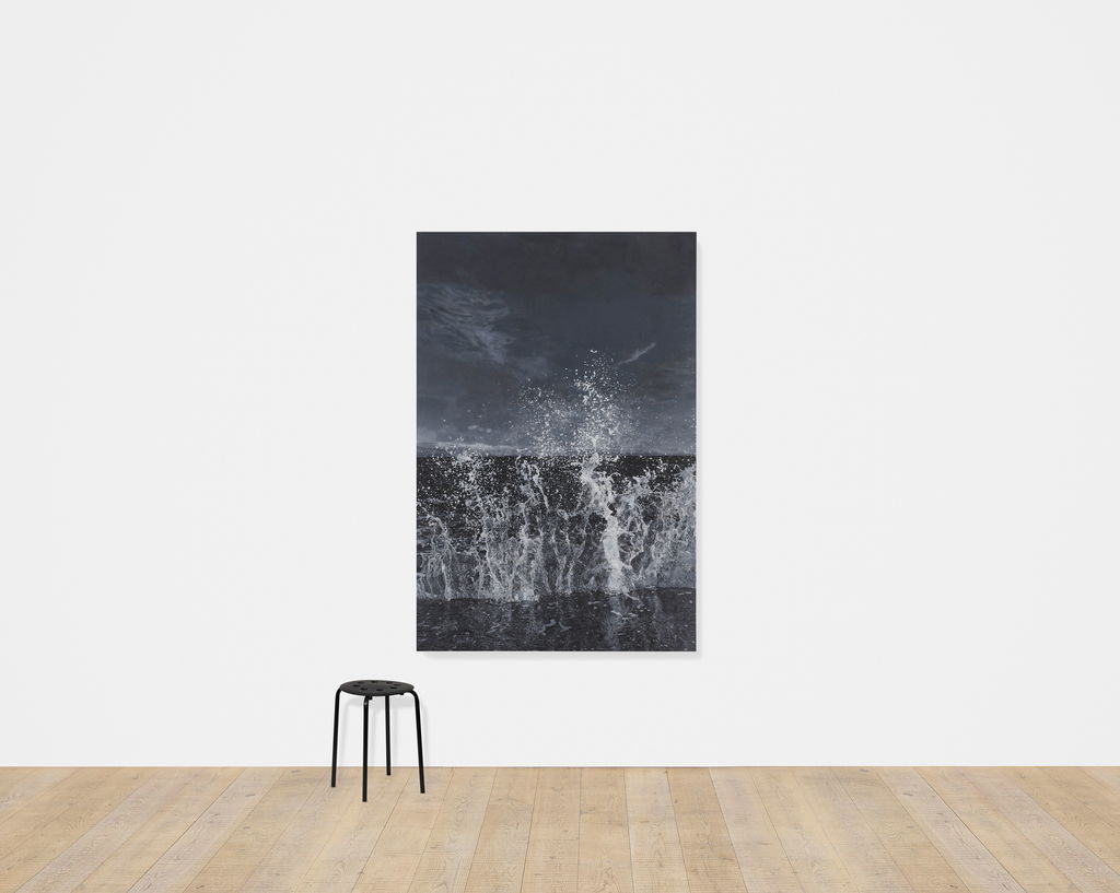 'Sea Paintings' marks the latest iteration in Hirst’s long-established practice of producing paintings after photographs, and freezes in greyscale the power and energy of coastal storms.