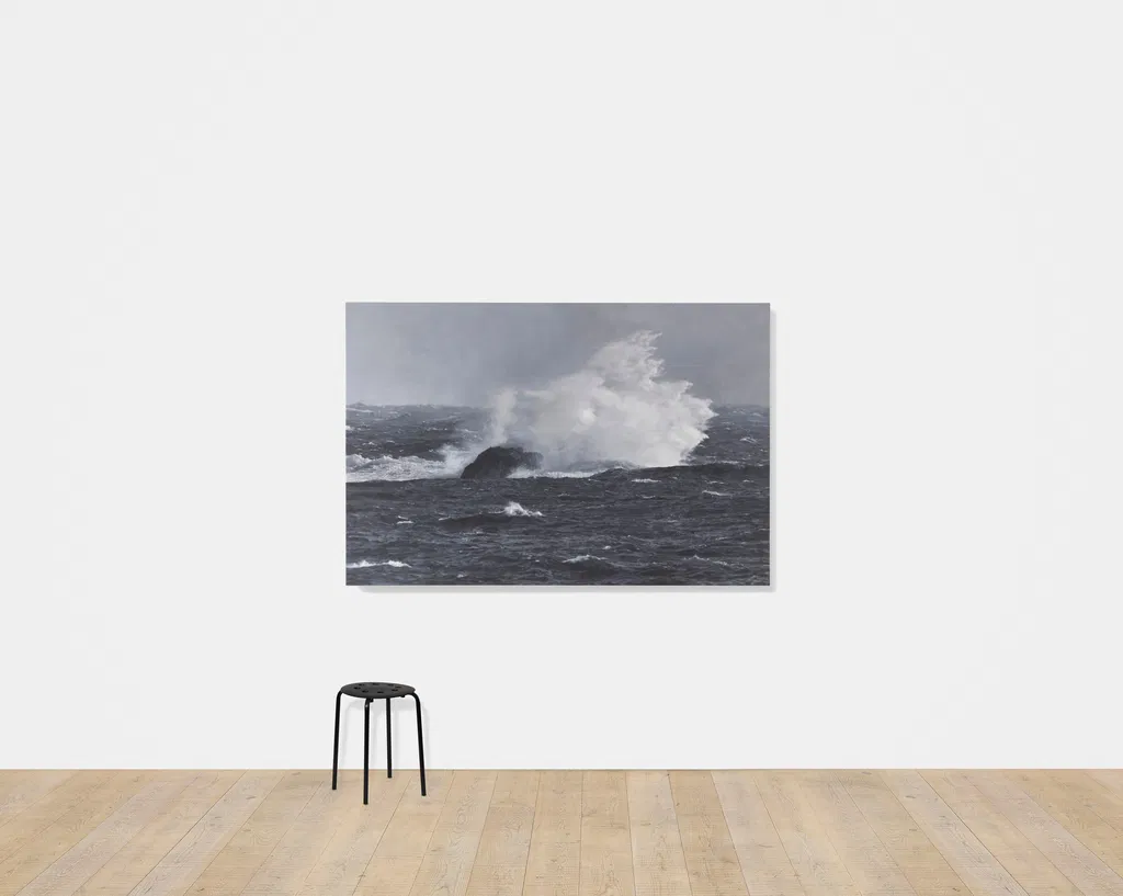 'Sea Paintings' marks the latest iteration in Hirst’s long-established practice of producing paintings after photographs, and freezes in greyscale the power and energy of coastal storms.