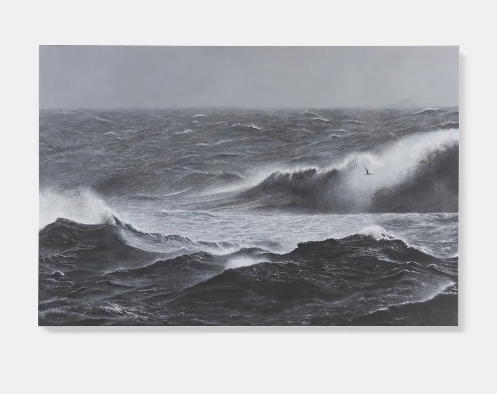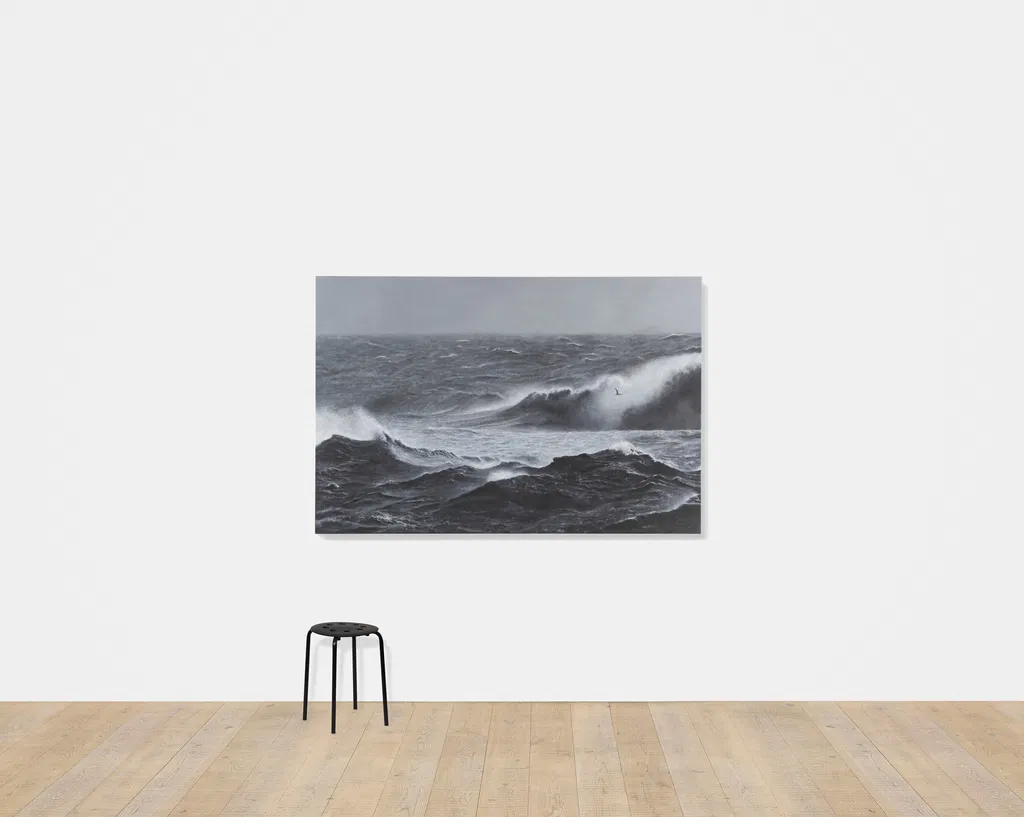 'Sea Paintings' marks the latest iteration in Hirst’s long-established practice of producing paintings after photographs, and freezes in greyscale the power and energy of coastal storms.