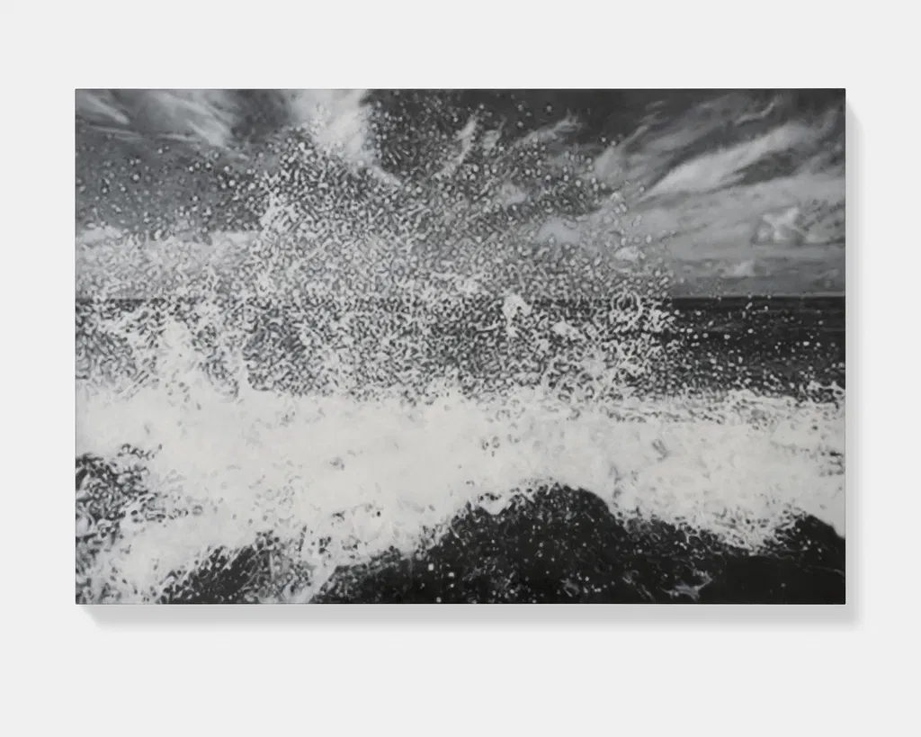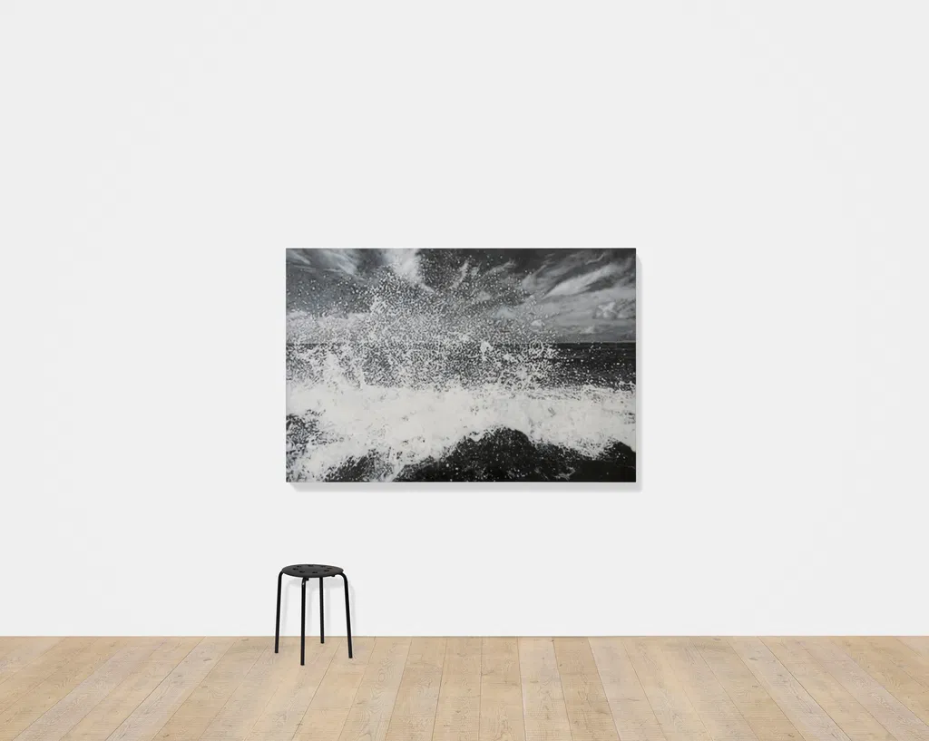'Sea Paintings' marks the latest iteration in Hirst’s long-established practice of producing paintings after photographs, and freezes in greyscale the power and energy of coastal storms.