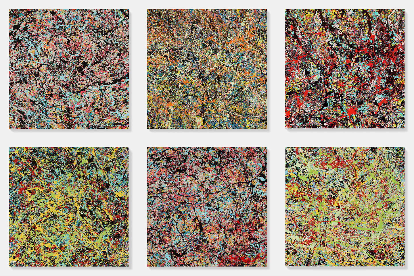The paintings are Household gloss on canvas, in varying dimensions, and each artwork is signed and titled on the verso.