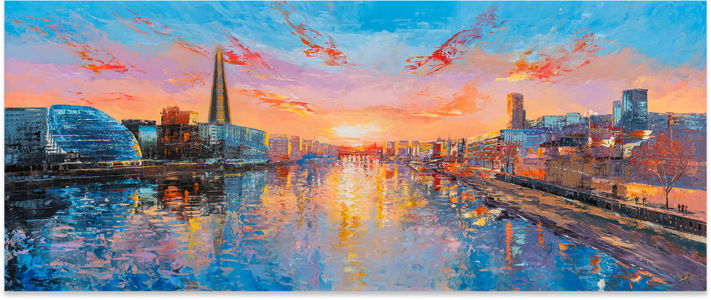Studio Works features iconic cityscapes of metropolises such as New York and London, seen from sweeping aerial views and immersive street-level perspectives. Kenton brings these scenes to life with bold colour contrasts, capturing the vibrant energy of a street alongside the landmarks of a skyline. In other works, lily ponds and landscapes evoke the tranquillity of nature. In contrast to Indian Paper Works, which purely relies on brushstrokes, these paintings emerge from tactile textures of paint manipulated with tools like brushes and spatulas. The works come in various dimensions, and each artwork is signed by the artist.