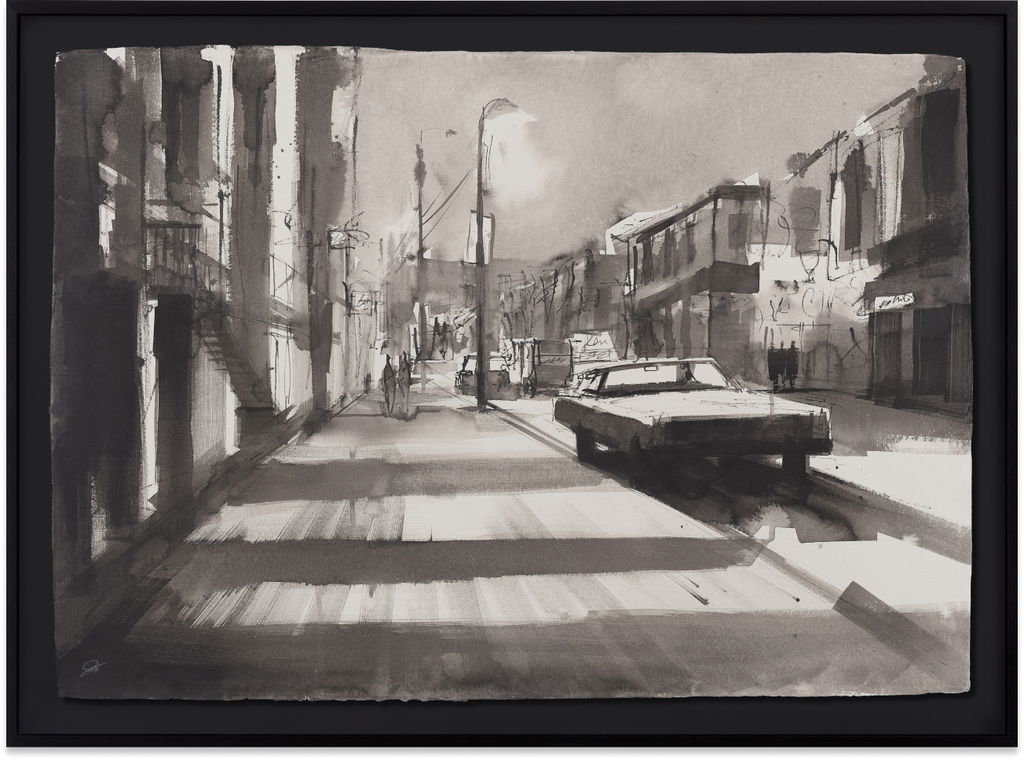 Indian Paper Works features ink and watercolour paintings on handmade Indian paper and range between the monochromatic and the colourful. The works come in various dimensions, and each artwork is signed on the front by the artist. They focus on cityscapes, rendering detailed observations of streets and architectures through impressionistic, flowing lines. Indian Paper Works is made up of delicate washes of paint layered through quick, spontaneous brushstrokes. This technique enhances their emotional impact and adds depth and movement to the compositions. Each piece is presented in a floating frame that highlights the natural, raw edges of the paper.