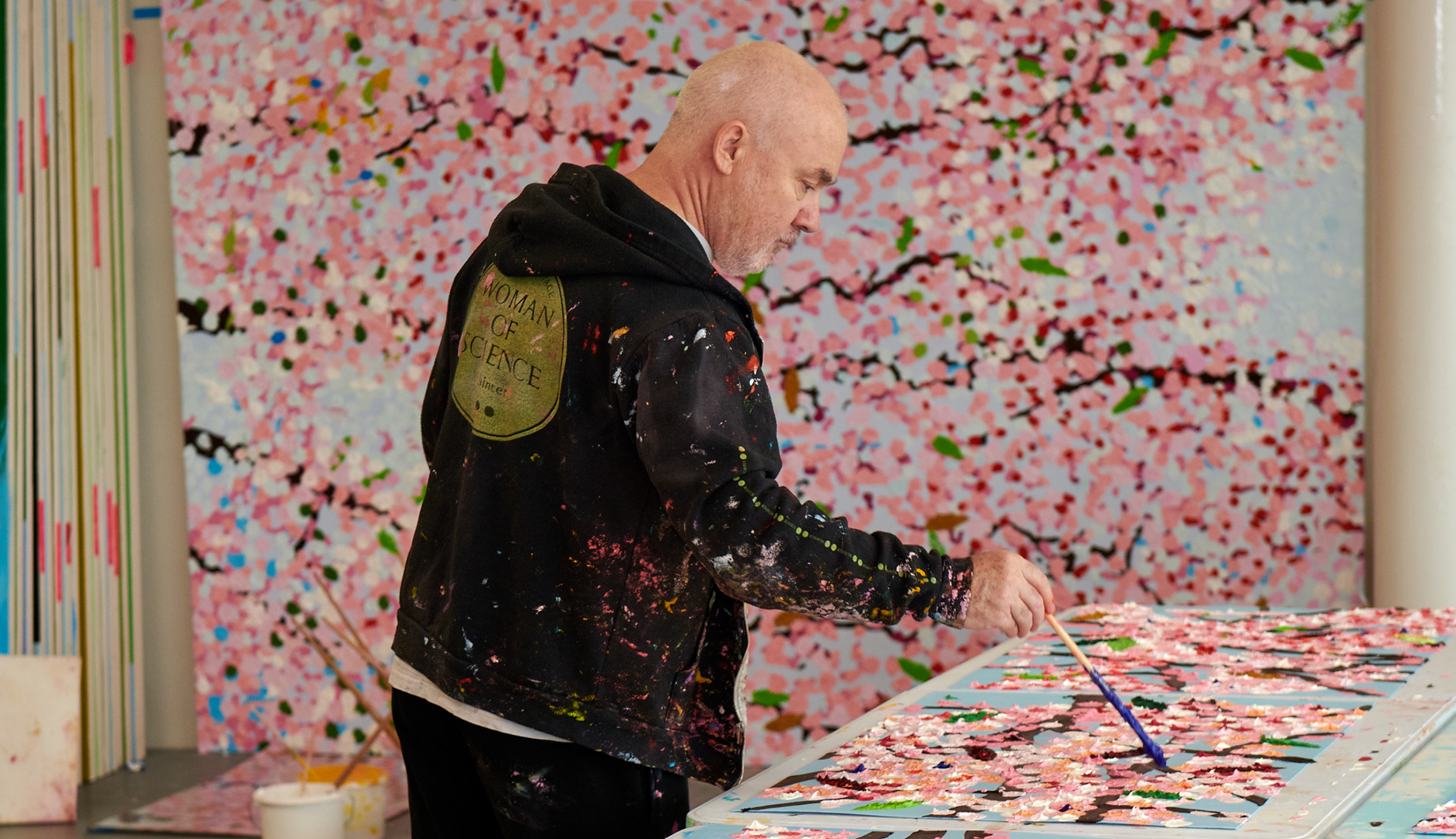 Arranged side-by-side across long tables in his studio, Hirst worked on several Paper Blossoms at a time, moving up and down the tables as he built up layers of thick, tactile paint. This process recalls the creation of his monumental Cherry Blossoms paintings: ‘I was getting lost in painting and wanted viewers to get lost in my paintings’.