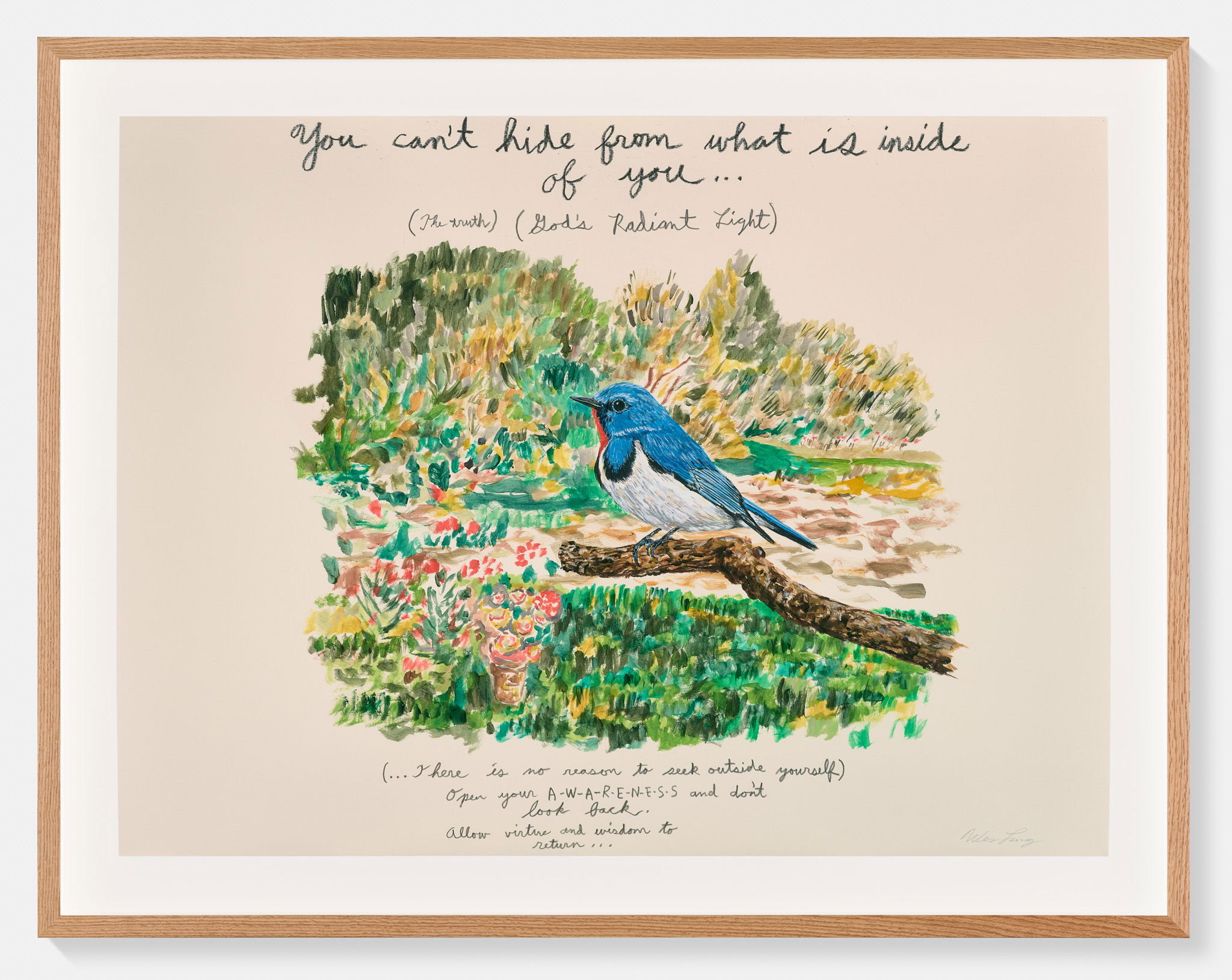 Lang makes birds – what he has described as guides to happiness – the centre of Thank You God, capturing a variety of species in different stages of movement and flight. His depictions of birds coincide with internal reflections and his embrace of spirituality as he was preparing for a new child. Lang’s use of birds to explore this period of preparation gained new resonance when, in the midst of making the Thank You God works, a bird’s nest was built outside a window of his home. Lang describes watching the mother bird plan for and raise her own children as a powerful source of inspiration.