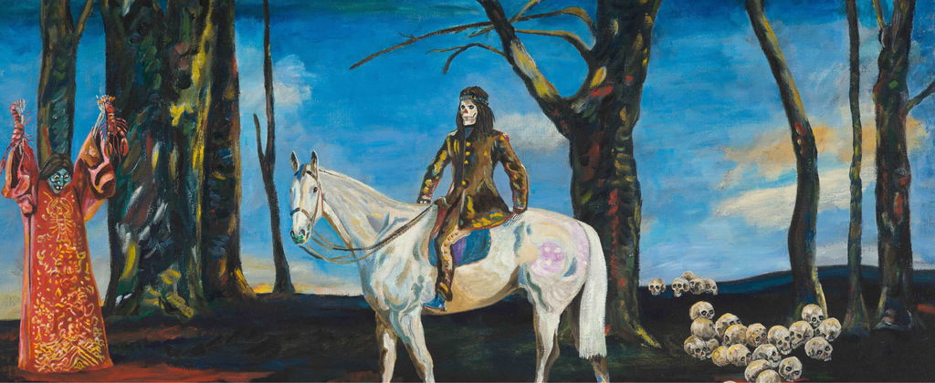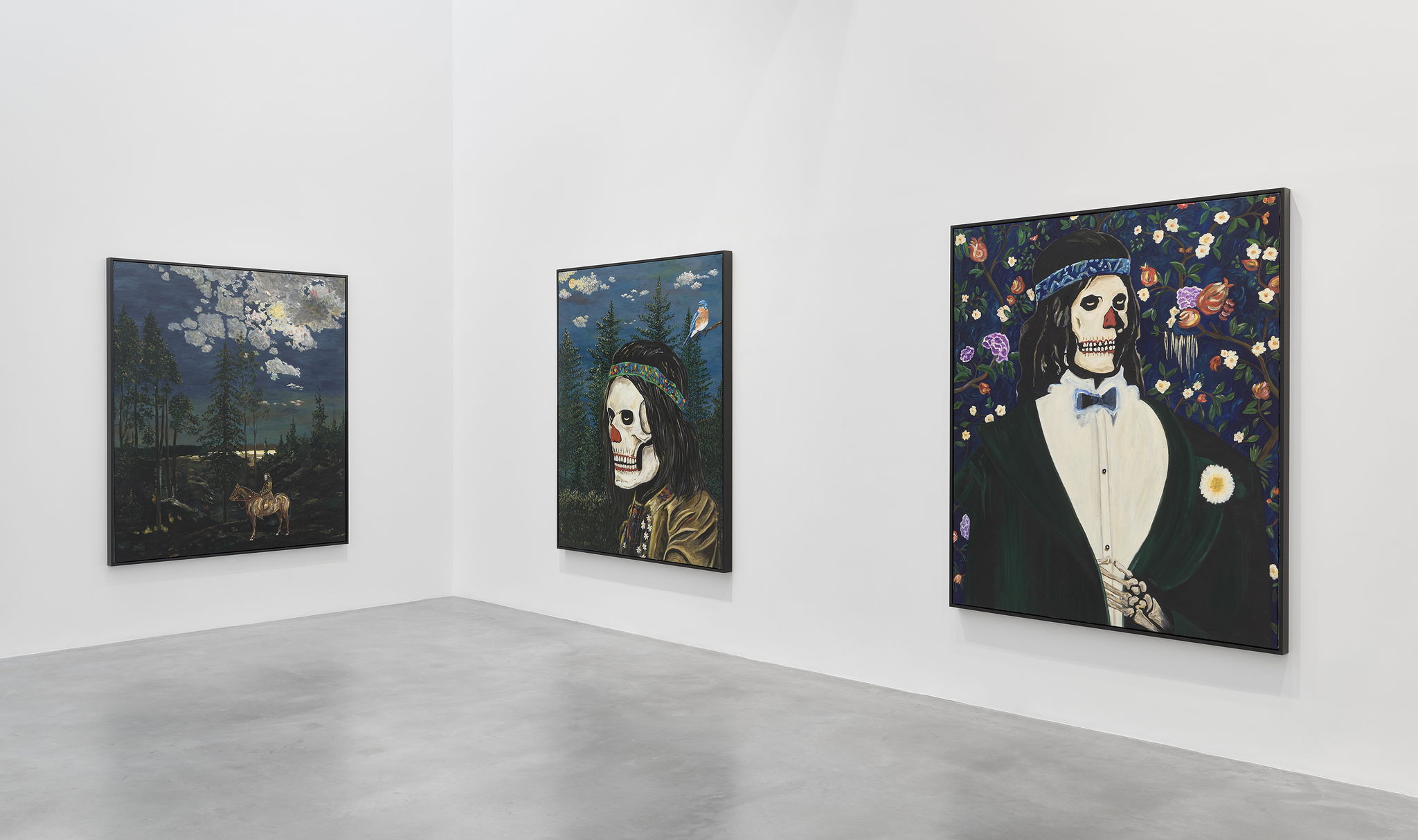 The Black Paintings series features works produced between 2022 and 2024 that are populated by Lang’s distinctive group of characters, namely his favoured skeleton, but also animal-like and otherworldly beings. At times set against completely obscured, dark backgrounds, while at others lush landscapes, Lang’s compositions are story-like.