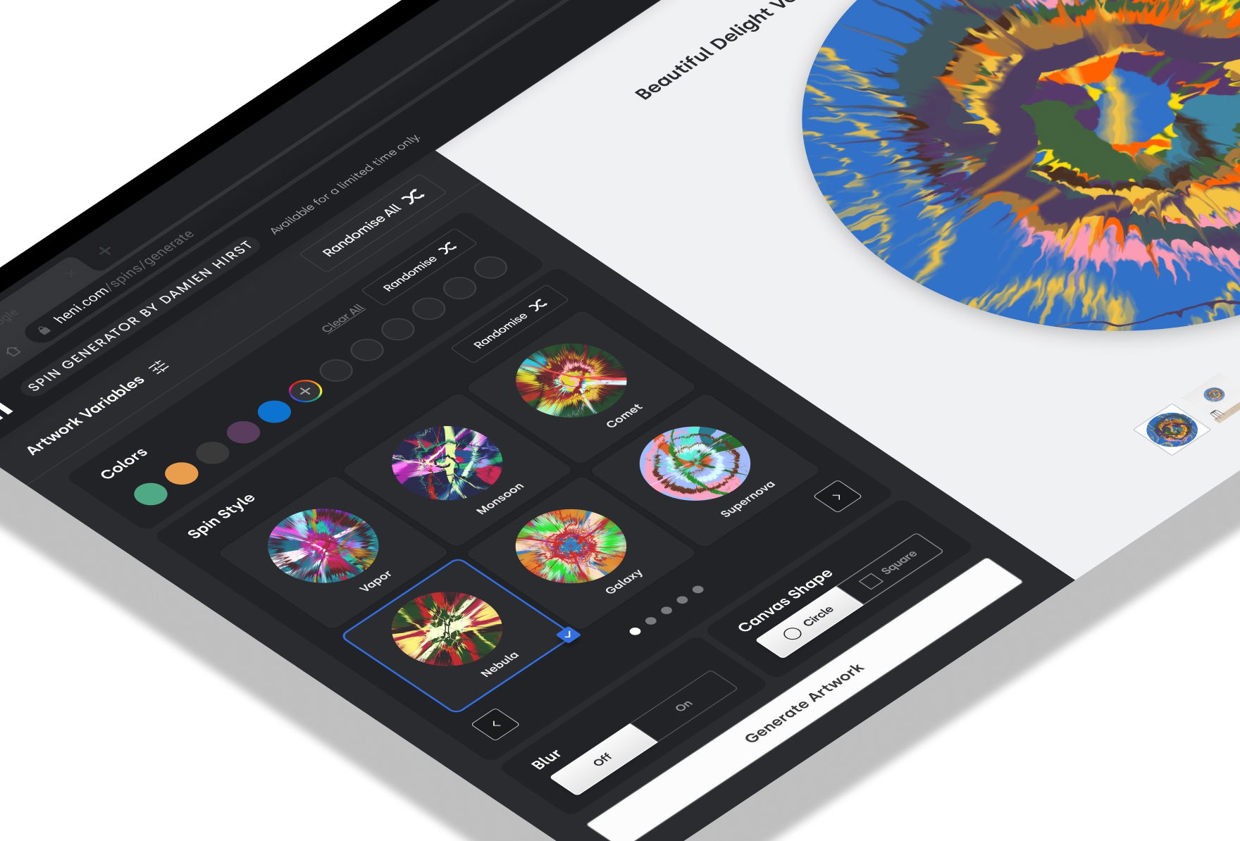 HENI is delighted to present The Beautiful Paintings, the revolutionary new artwork from Damien Hirst that blurs the boundaries between digital and physical art creation using generative and machine learning algorithms. Marking the newest iteration of Hirst’s iconic ‘Spin Paintings’, known for their energetic splashes of colour, The Beautiful Paintings gives collectors the opportunity to choose their own combination of colours, styles, shapes, sizes, and mediums to generate unique artworks and titles.