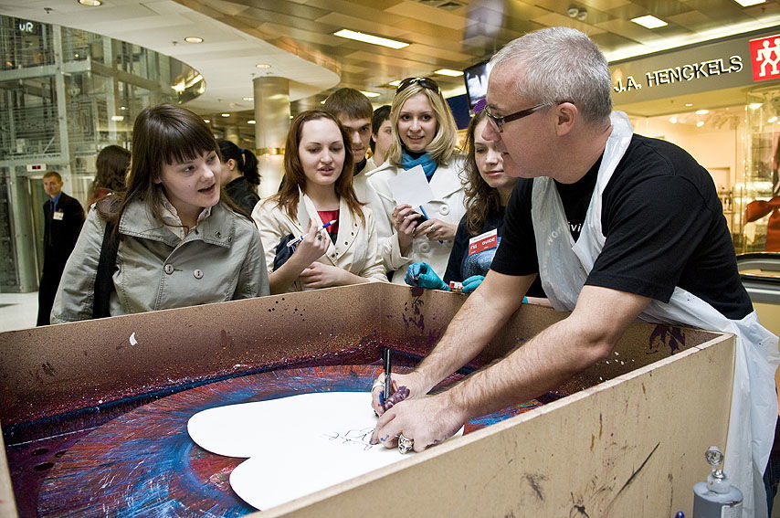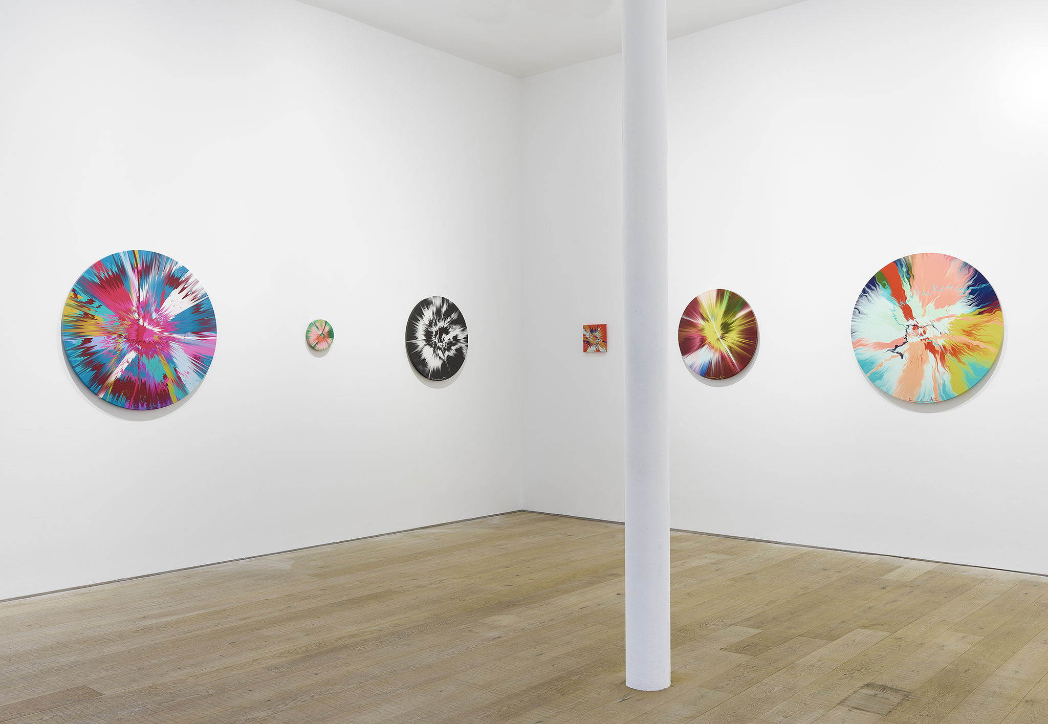 Tracing its roots back to 1992, ‘Spin Paintings’ was Hirst’s reaction to Abstract Expressionism and his desire to devise a machine to make art, based on his idea that one could mechanically create ‘a clinical system’ to produce ‘art without angst’. Rather than creating a composition directly through his brush, Hirst began pouring pigments onto his canvases as they spun, allowing the machine to facilitate chance movements and colour interactions.